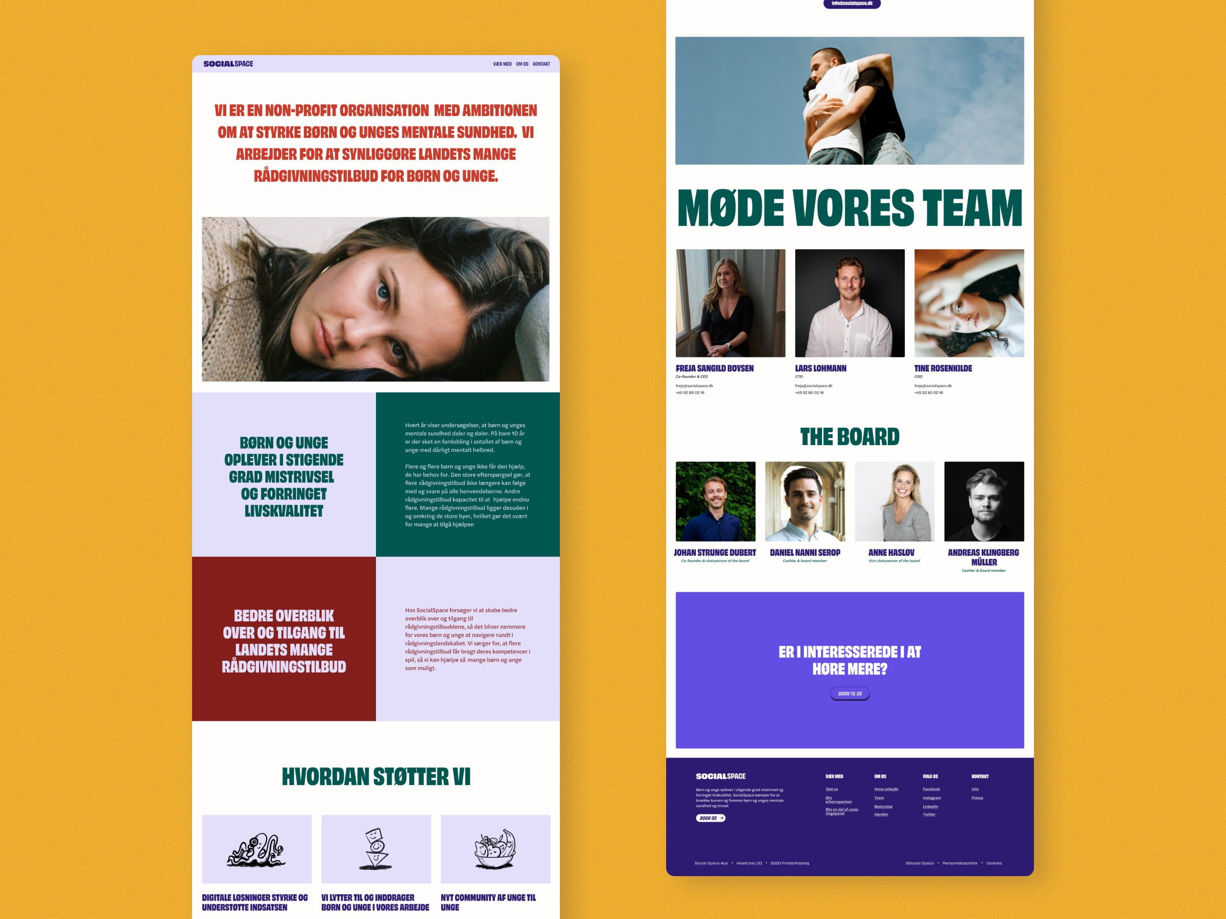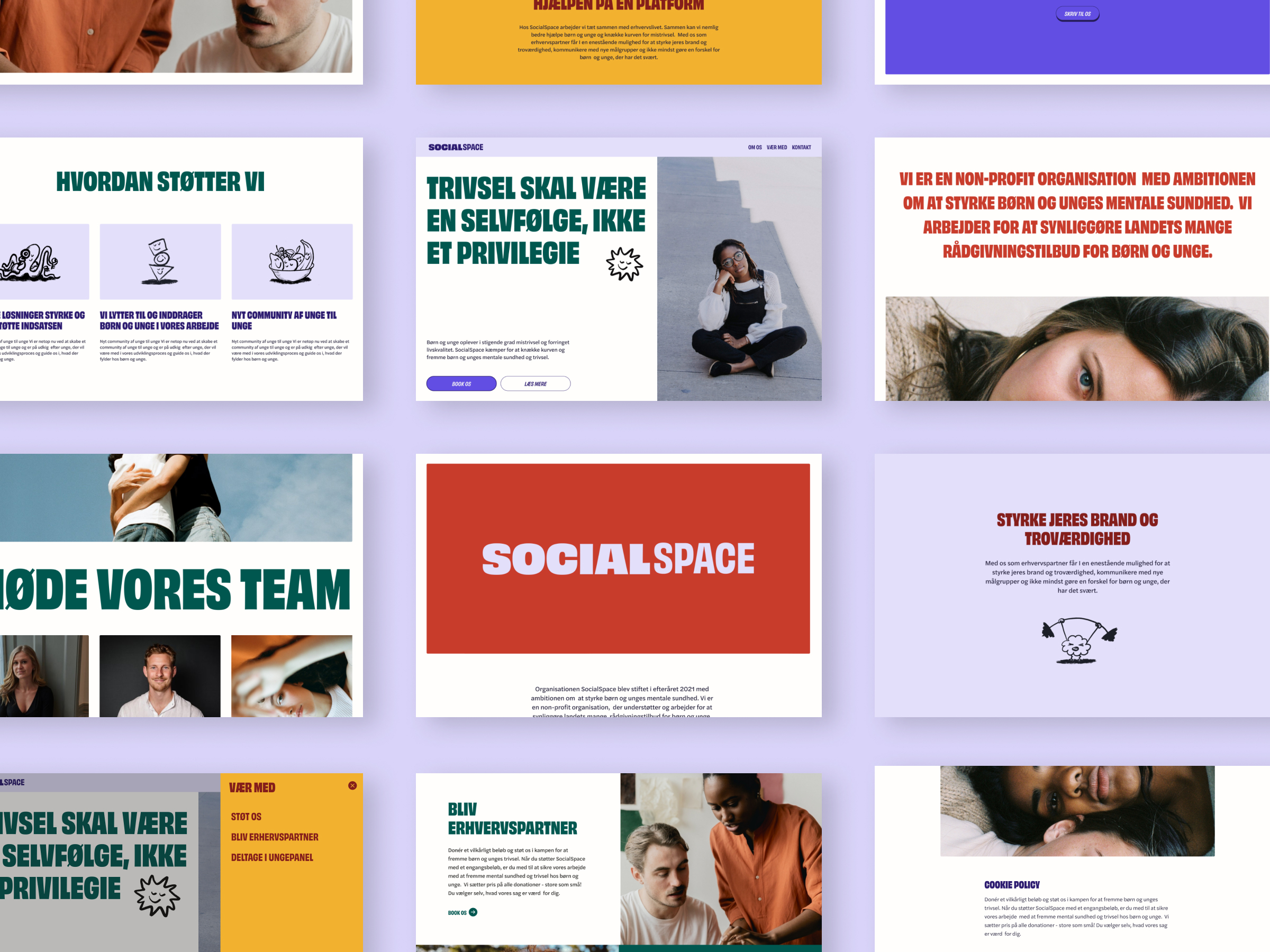 More and more children and young adults experience dissatisfaction and a reduced quality of life. SocialSpace, fights to strengthen the mental health of children and young adults by giving them easy access to the many supporting organisations across Denmark. SocialSpace felt that their current brand and web presence wasn’t accurately representing their offering and didn’t captivate their target audience. SocialSpace wanted a rebrand and redesign to encourage young adults to seek help and creating a comfortable and safe environment for them.